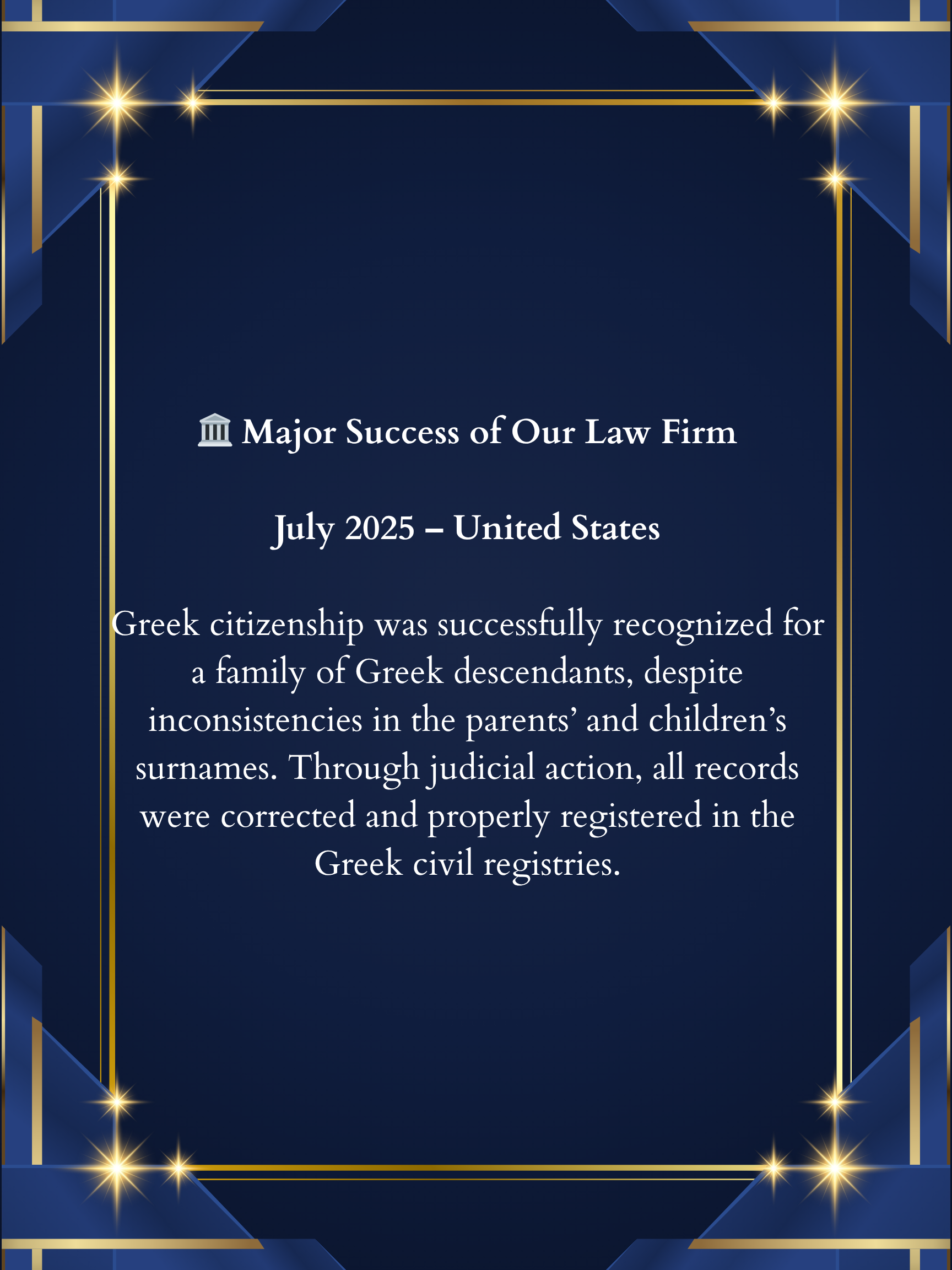 Greek citizenship was recognized for an entire family despite surname inconsistencies. Through judicial action, all records were corrected and properly registered.