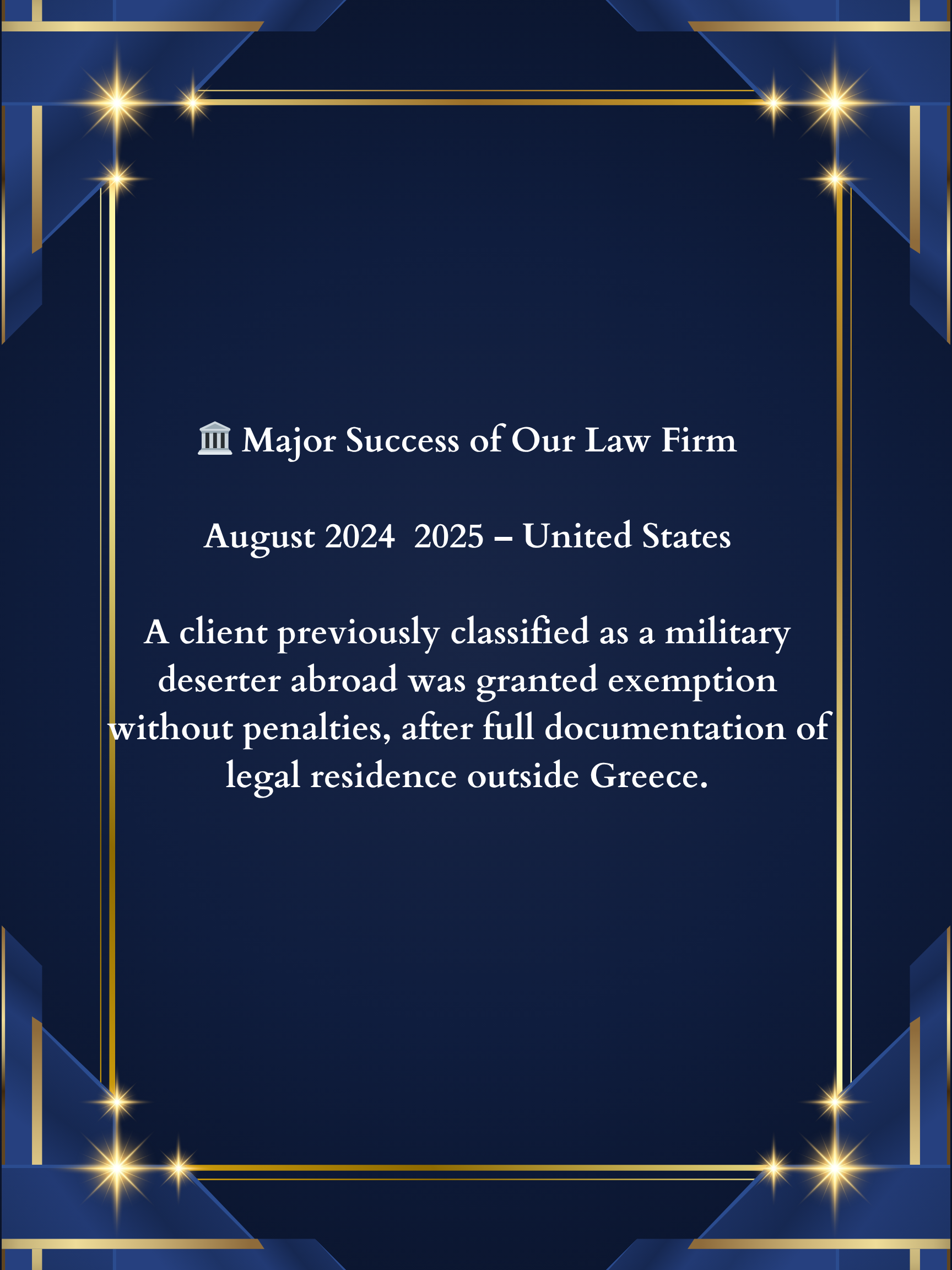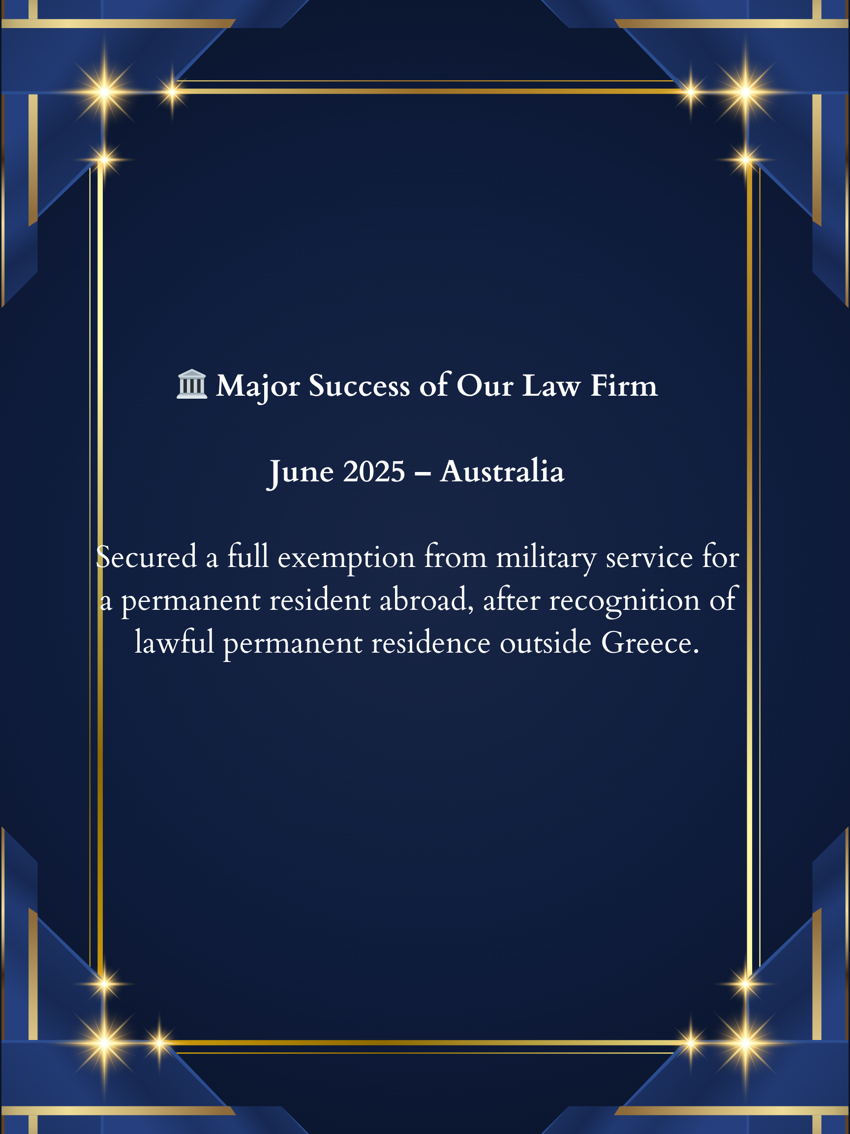 Secured a full exemption from military service for a permanent resident abroad, following recognition of lawful residence outside Greece.