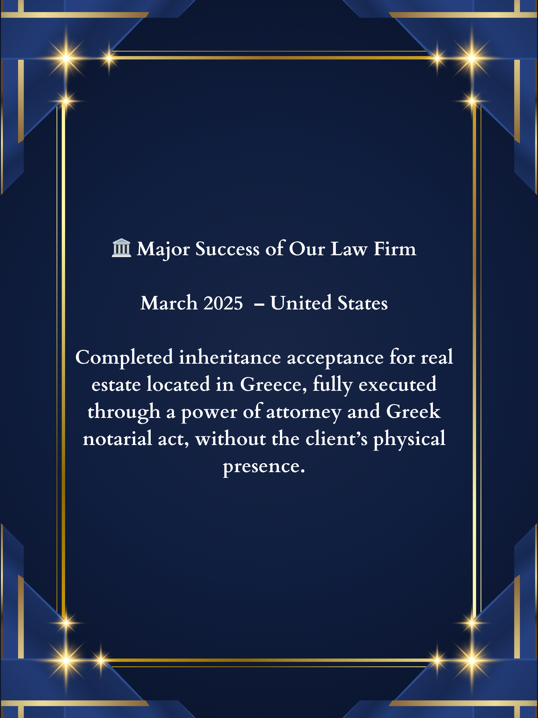 Completed inheritance acceptance for real estate in Greece through POA and Greek notarial act—no presence required.