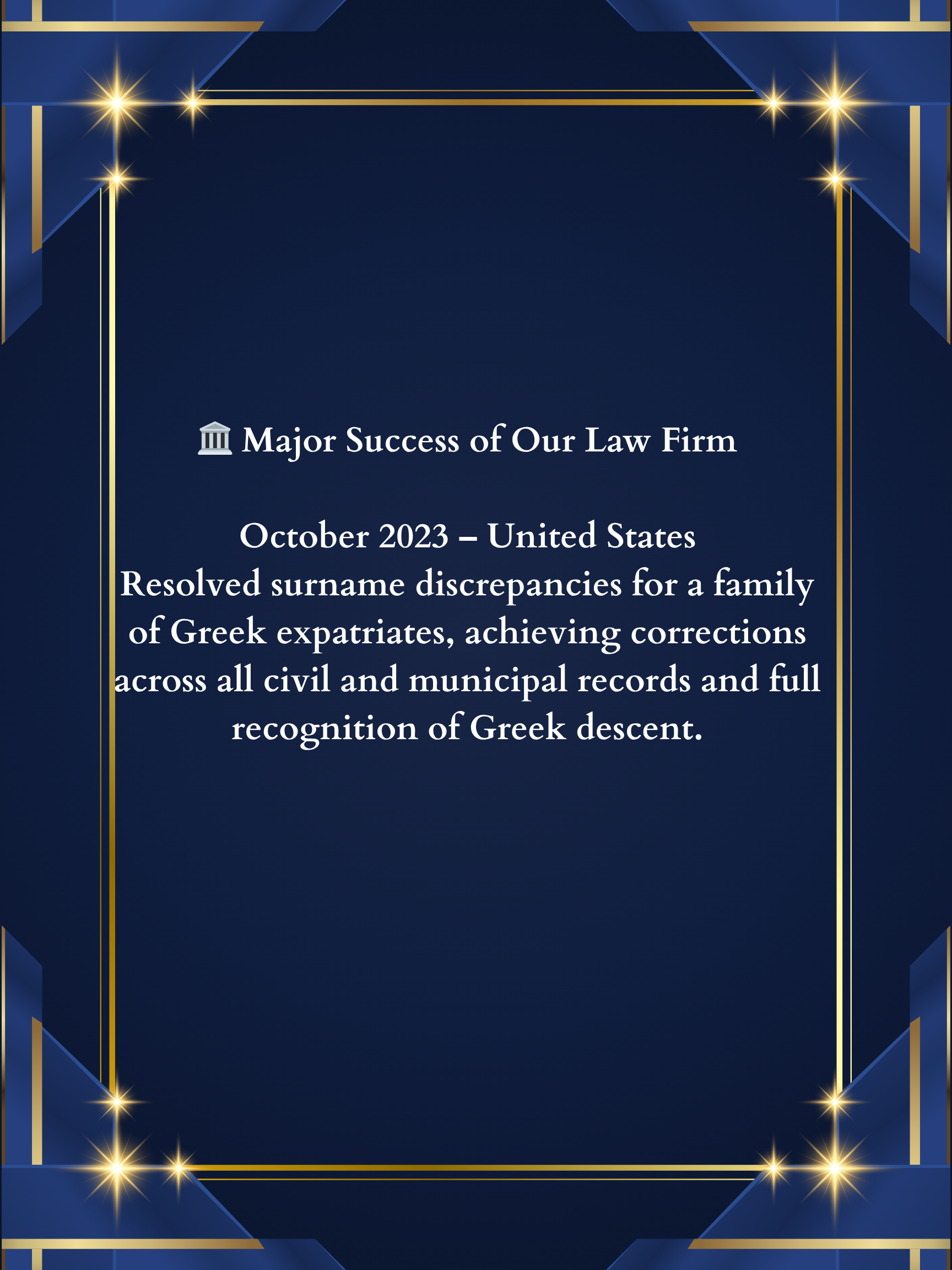 Resolved surname discrepancies for a Greek expatriate family—full correction and recognition achieved.