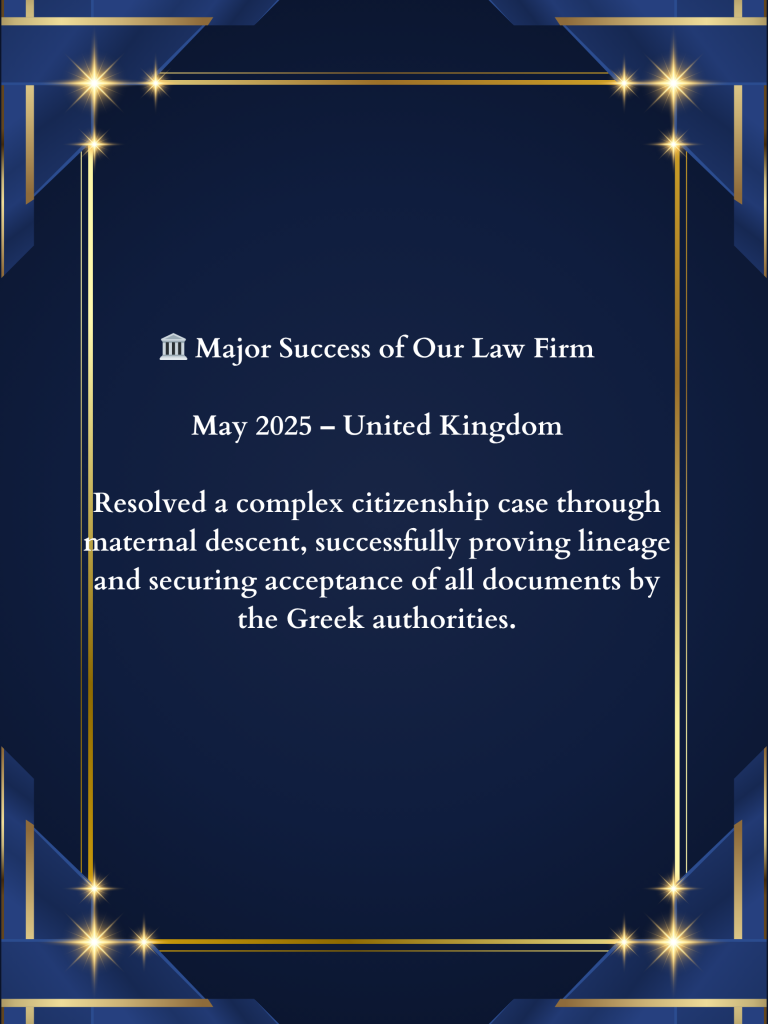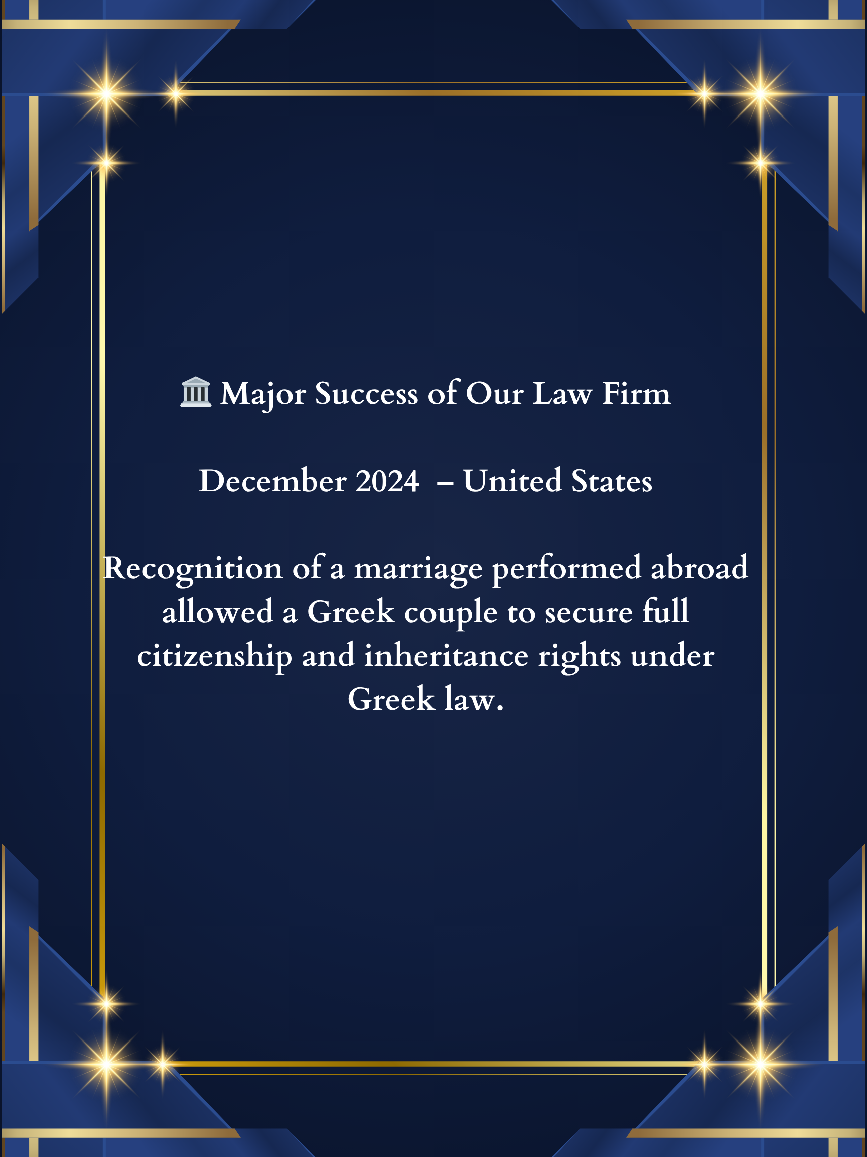 Recognition of a foreign marriage allowed a couple to secure full Greek citizenship and inheritance rights.