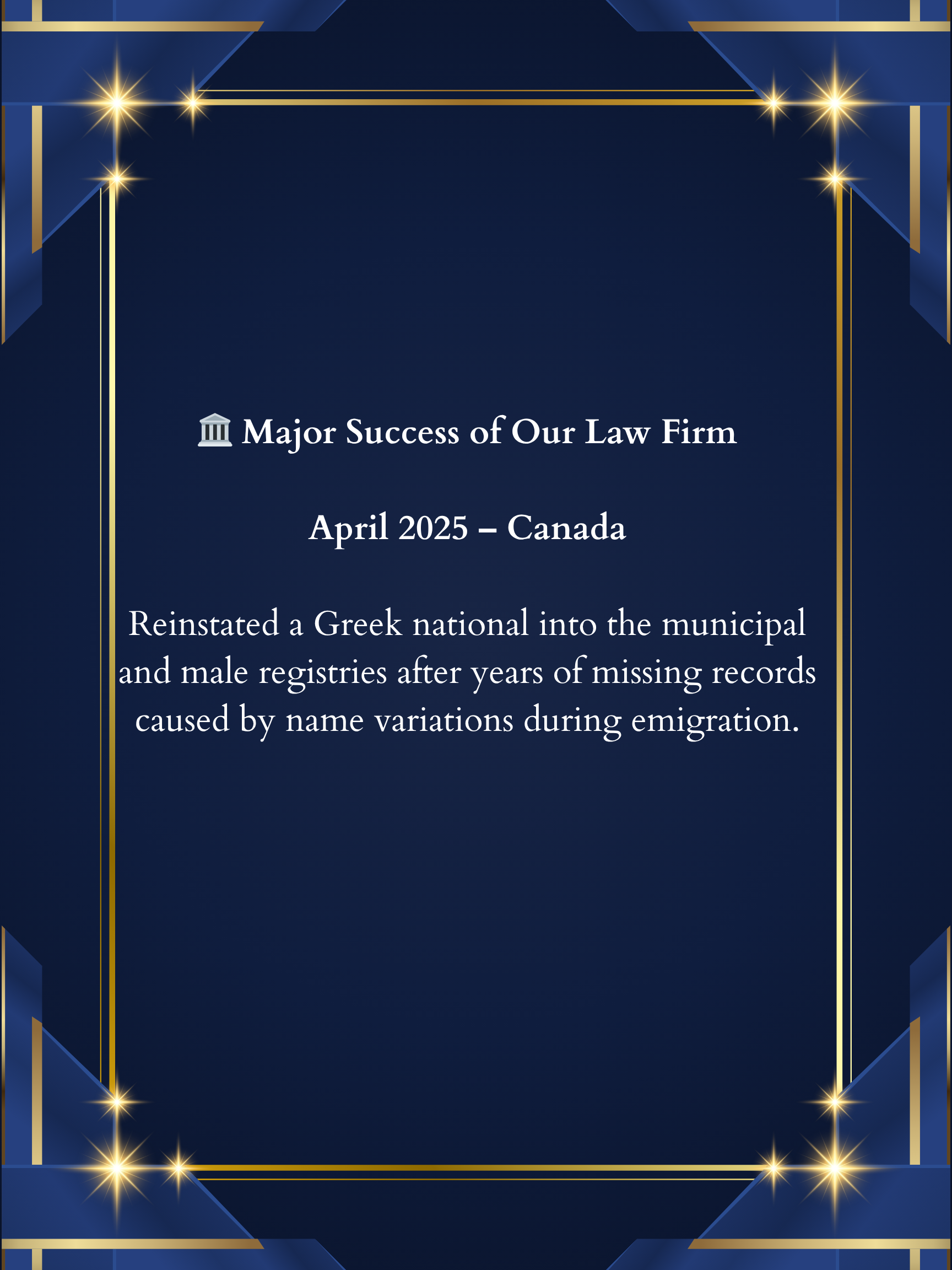 Reinstated a Greek national into the municipal and male registries after years of missing records caused by name variations during emigration.