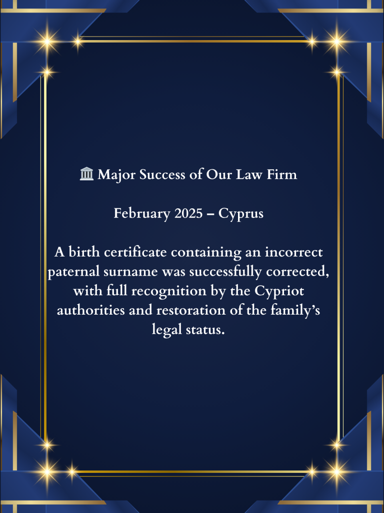 Corrected a birth certificate with an incorrect paternal surname and secured full recognition by Cypriot authorities.