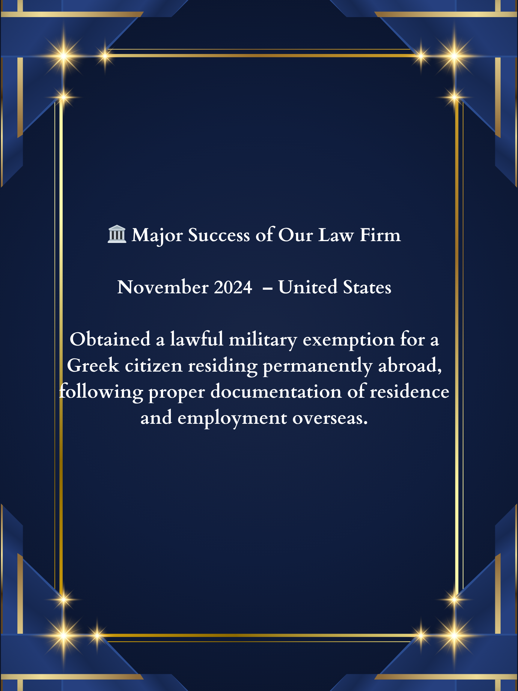 Obtained a lawful military exemption for a Greek citizen residing permanently abroad.